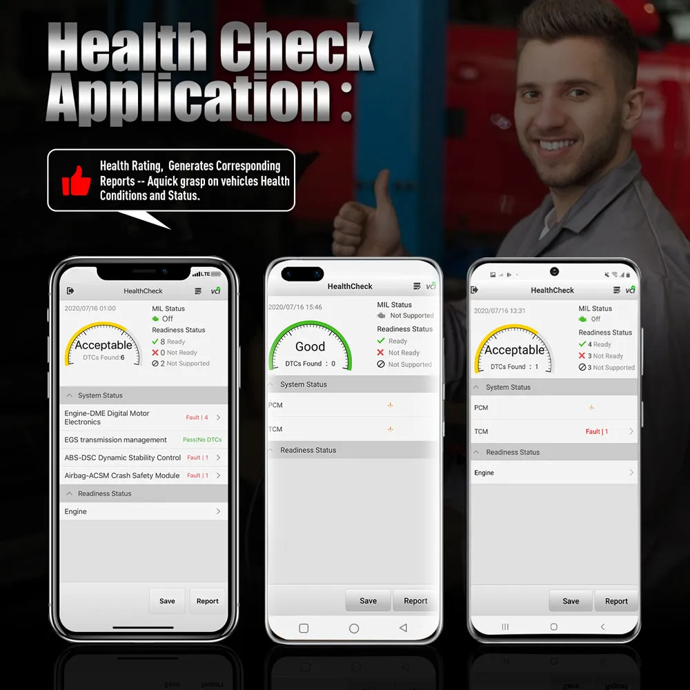 The AP200H snapshot easy-to-use Health Check Application is used to identify health state of your car. With this function, you can knowhealth rating, generatecorresponding reports, and gaina quick grasp on vehicle health conditionand status.It can make you know the required service and theneeded information, thus, you cantake care of your vehicle easier. It cansave repairreportsfor diagnostic and maintenance service sessions as well.