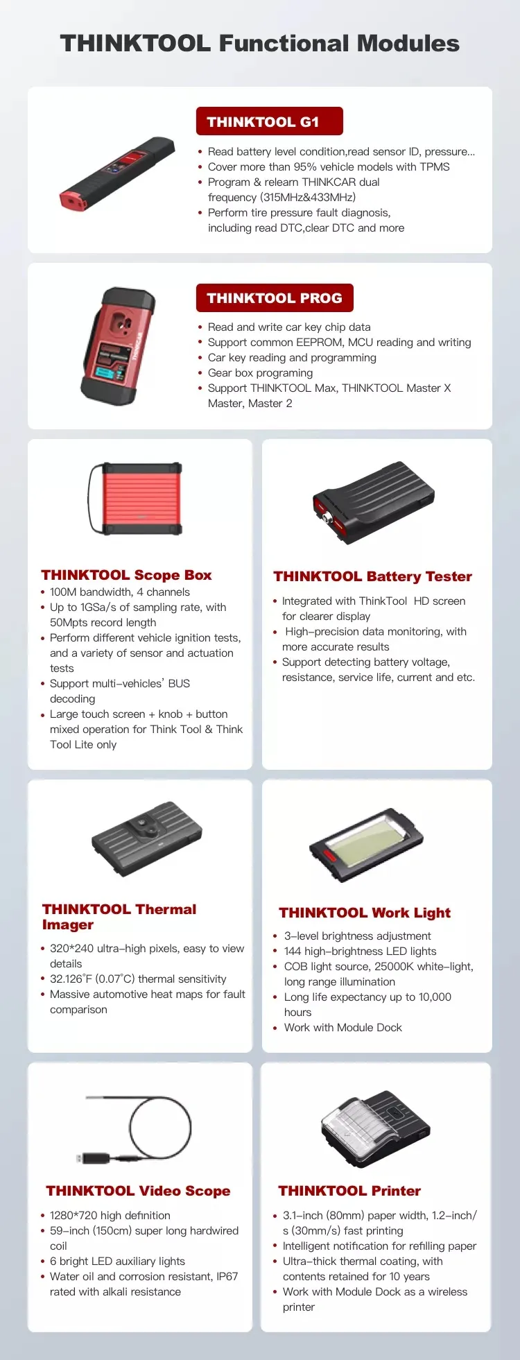 THINKTOOL MAX is equipped with four intelligent diagnostic modules, ThinkEasy WirelessBattery Tester, Video Scope, ThinkTpms G1 , Oscilloscope. All modules connect to the tablet via Wi-Fi or USB cable, making diagnosis easier and faster.